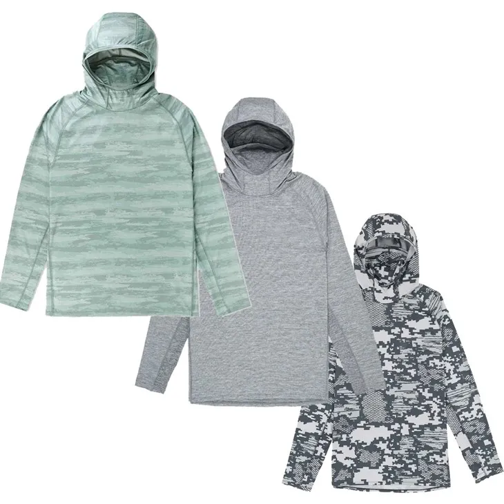 Hoodie memancing selalunya mempunyai perlindungan matahari UPF (Ultraviolet Protection Factor) terbina dalam, melindungi pemancing daripada sinaran UV berbahaya matahari semasa berjam-jam di atas air. Ini membantu mengelakkan selaran matahari dan mengurangkan risiko kerosakan kulit jangka panjang, meningkatkan keselesaan dan keselamatan semasa aktiviti memancing di luar.